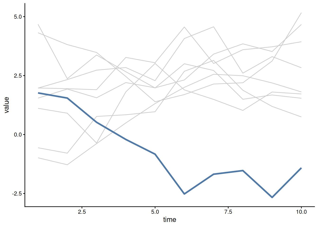 Sometimes, you want to highlight a specific group as it compares to the other groups in the dataset. A spaghetti plot is fine here, but with appropriate highlighting using color and line width: